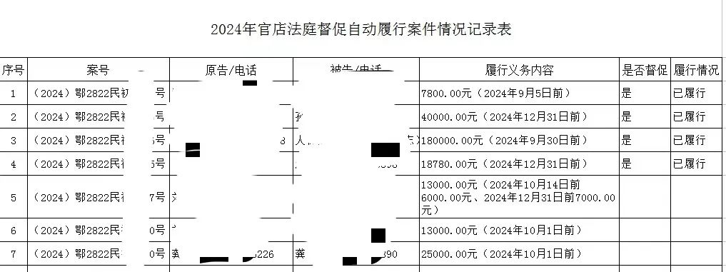 “现场调解,当天止分”,是官店法庭推进诉源治理工作的一个缩影。不仅如此,法庭还在深化诉源治理的过程中总结经验,形成长效机制,推出了《督促履行记录表》,按照调解协议约定的时间联系当事人,督促当事人自动履行义务,及时兑现合法权益。目前,法庭已通过该工作机制促使当事人自动履行义务30件。