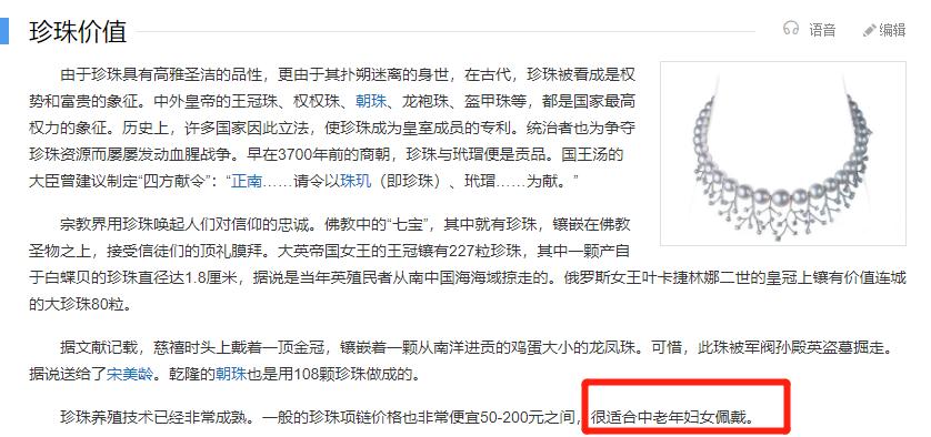 不止多数人会选,就连我们所熟悉的度娘都把珍珠定义为:适合“中老年妇女”佩戴。