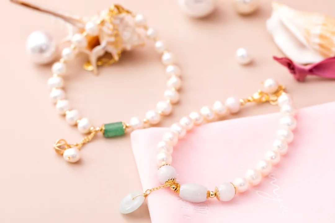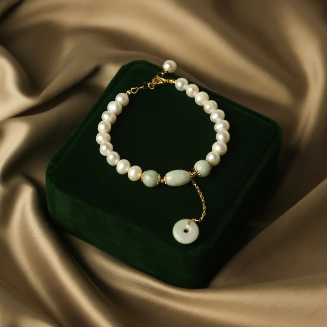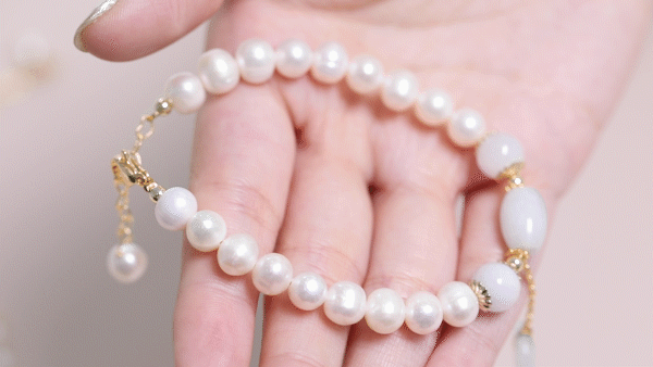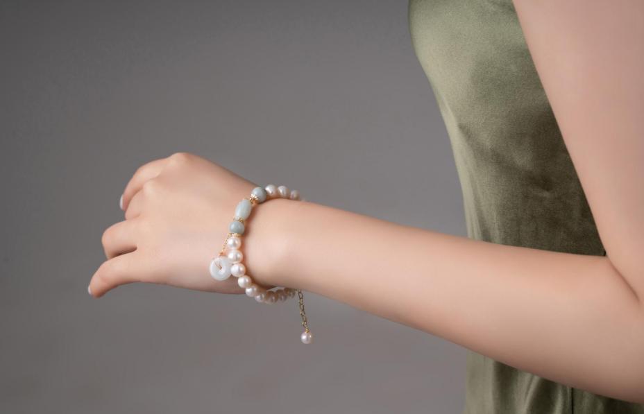 手链扣尾还有一颗珍珠点缀,与前面的玉石吊坠相互呼应。