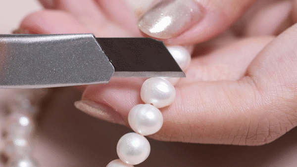 第一种:用小刀轻轻平刮珍珠后,会出现细小的粉末,真珍珠轻轻一抹又会完好如初,假珍珠则相反。