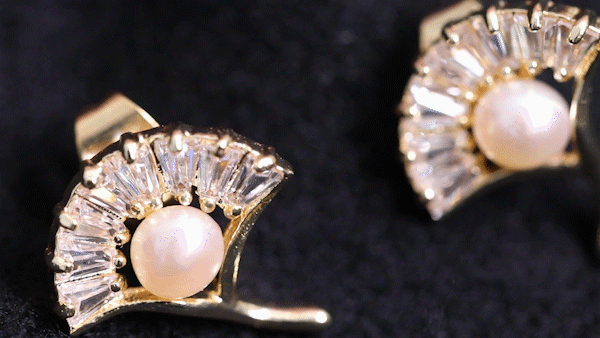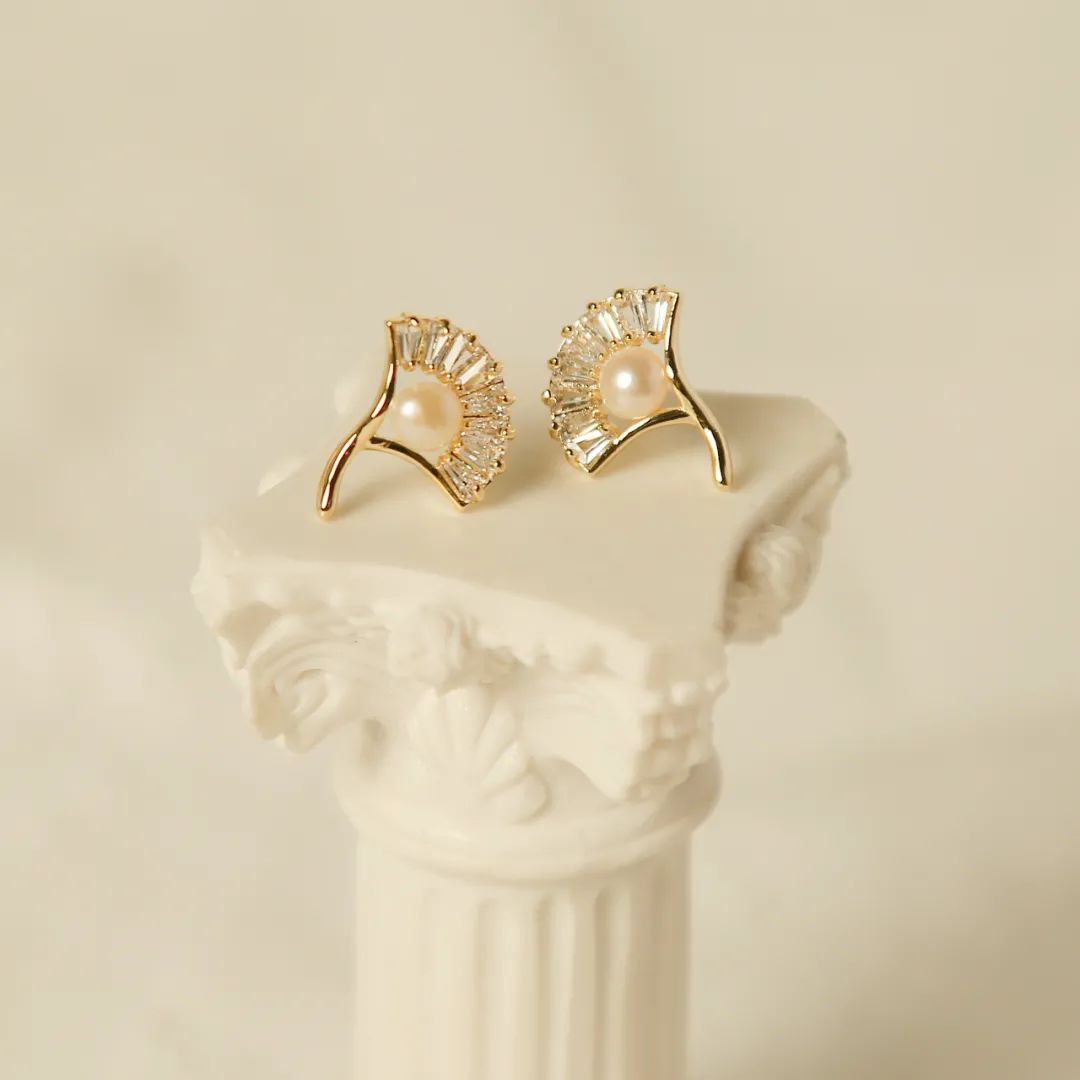 它由铜镀金几何金属、不规则锆石以及一颗直径0.7cm的淡水珍珠组成。