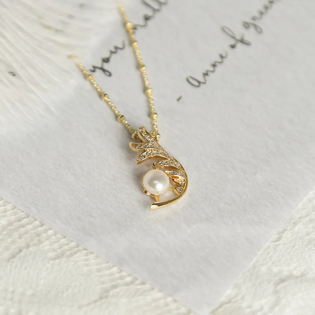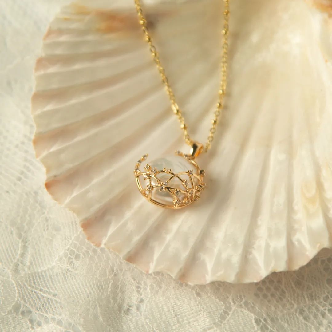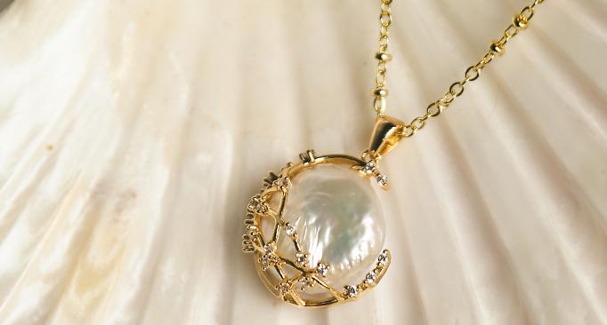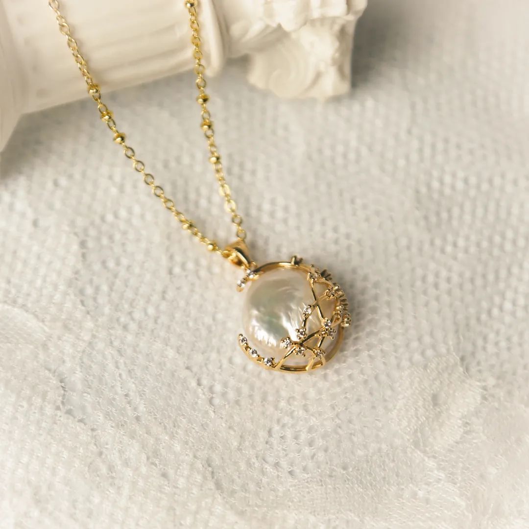 将巴洛克珍珠作为吊坠的主角,搭配用14K铜镀真金打造的月亮造型,让它在月亮的拥抱下,散发着皎洁的光芒。