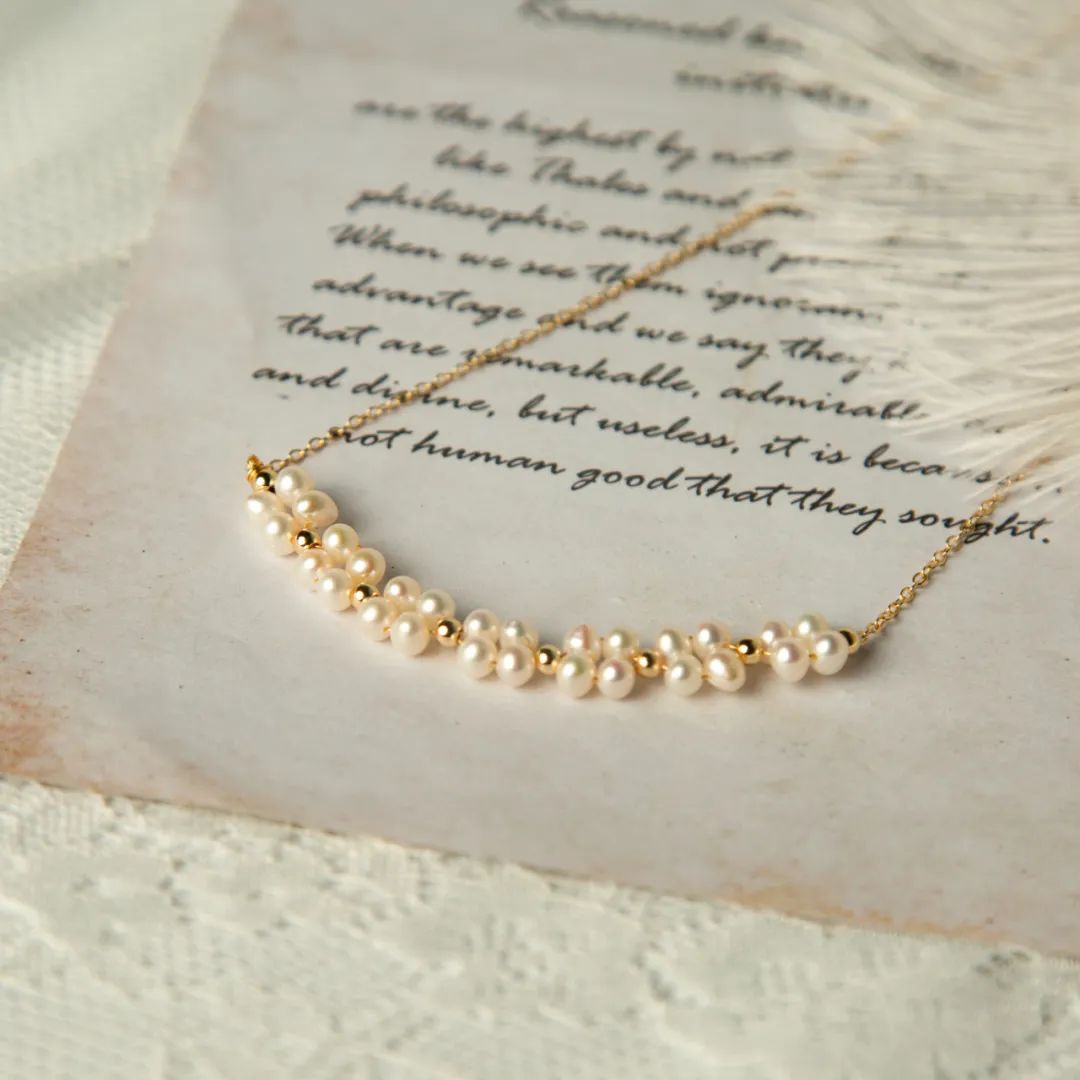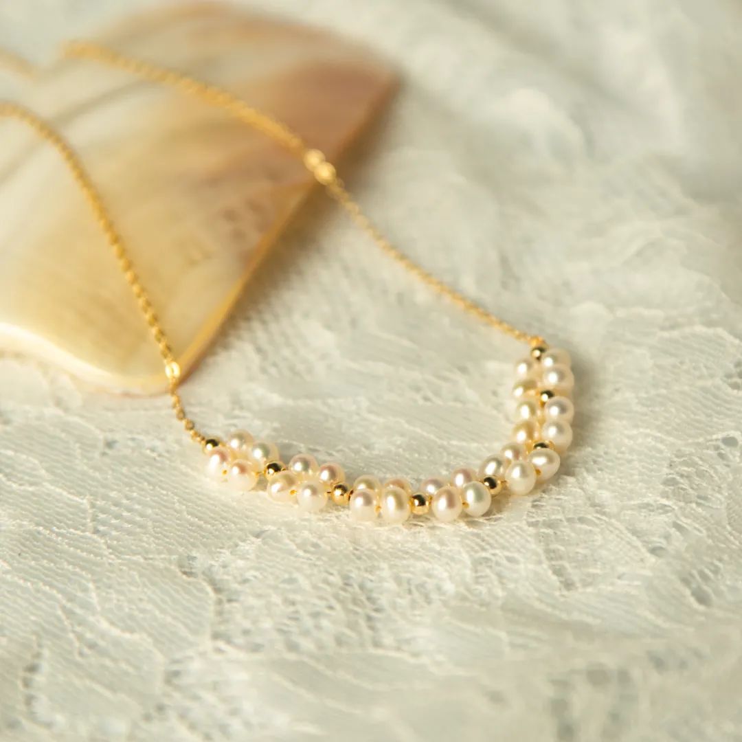 颗颗饱满光亮的天然淡水珍珠串成的链条,在阳光下更加柔美。
