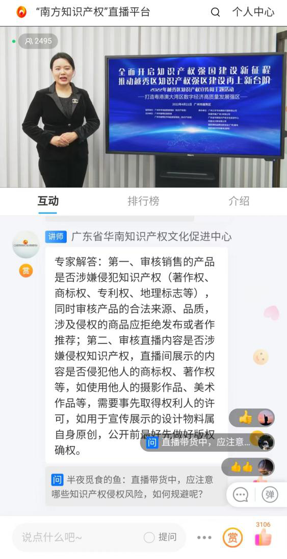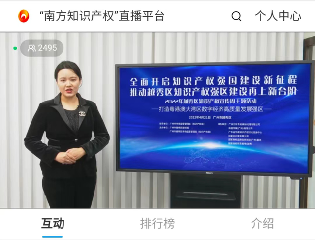 首场论坛活动以“打造粤港澳大湾区数字经济高质量发展强区”为主题,旨在增强全社会尊重和保护知识产权的意识,积极推进知识产权强国建设,充分塑造尊重知识、崇尚创新、诚信守法、公平竞争的知识产权文化理念,强化数字赋能知识产权治理,运用信息技术提升知识产权政务服务便利化程度,推进知识产权保护服务改革,为越秀区立足新发展阶段、贯彻新发展理念、构建新发展格局、推动粤港澳大湾区高质量发展营造良好舆论氛围。受疫情影响,本次活动采取线上直播的形式举行,线上观看达2500人次。