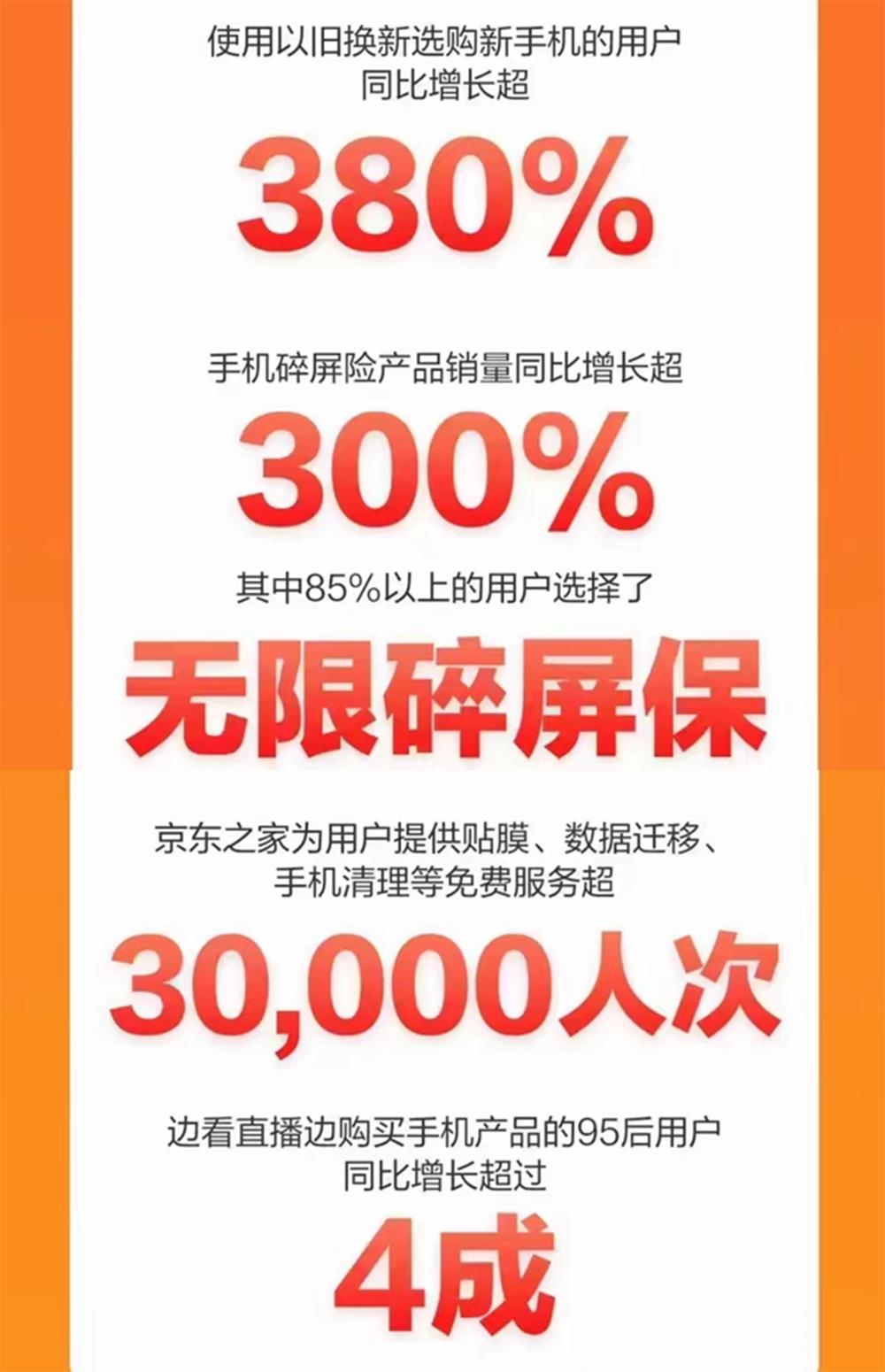 比如“以旧换新购机”用户同比增长了380%、手机碎屏险销量同比增长了300%、边看直播边购买手机产品的95后用户同比增长超过4成,京东甚至还统计了京东之家为用户提供贴膜、数据迁移、手机清理等免费服务超过3万人次。