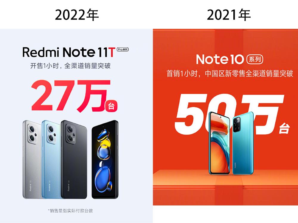 去年618的6月1日, Redmi Note10系列首销1个小时,销量突破了50万台。相比之下,两次首销的销量相差近一倍。