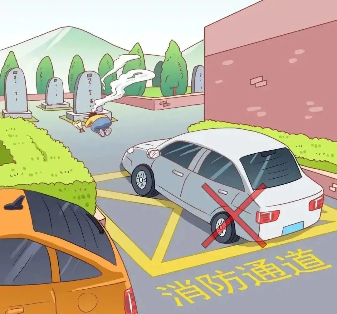 如驾车祭祀,应该将车辆停放在指定车位上,切勿占用消防通道,影响灭火救援。