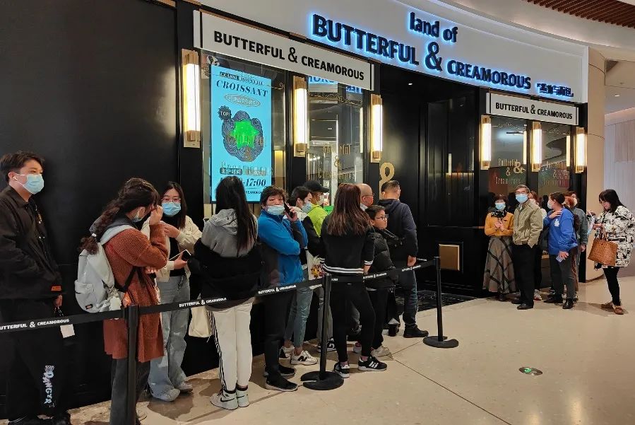 上海一家网红面包店刚开业时,许多人排队进去打卡。(图/视觉中国)