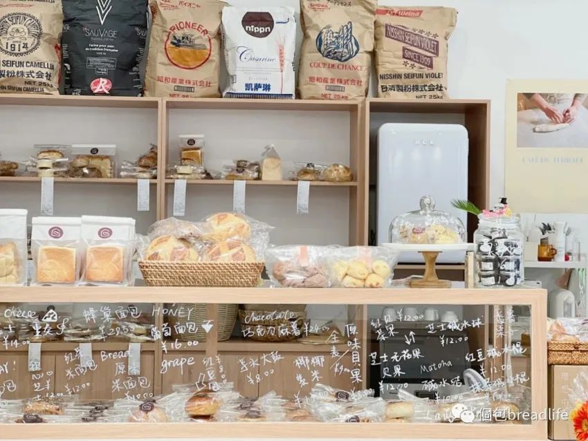 有店家在门口用大幅海报介绍自家出品的法包,均采用法国进口T55面粉,脆香外皮内藏蜂巢状气泡膜。主打口感松软日式吐司的店家,会直接把日本山茶花面粉摞在店里,当作铺面装饰的一部分。