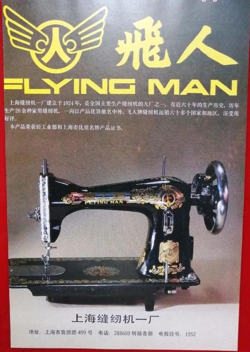 它的LOGO,并不是个长翅膀的人,而是一个有着两个翅膀滚滚向前的轮子。其实,叫它“飞轮”倒是蛮贴切的。另一个缝纫机的牌子“无敌”改作蝴蝶牌有点搞不明白,“无敌”这两个字毛主席也用,他在诗词里写道:“要扫除一切害人虫,全无敌。”