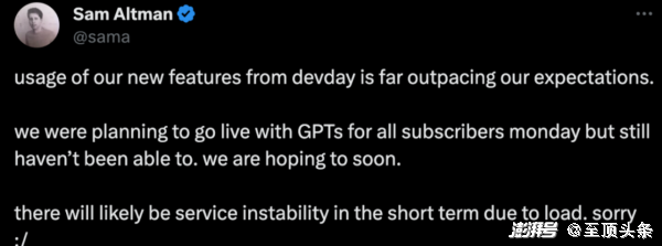 “大家对新功能的热情远超我们预期,我们原计划本周一为所有订阅者提供GPTs,但现在(周二)仍然没能实现,我们希望这个进度可以加快。