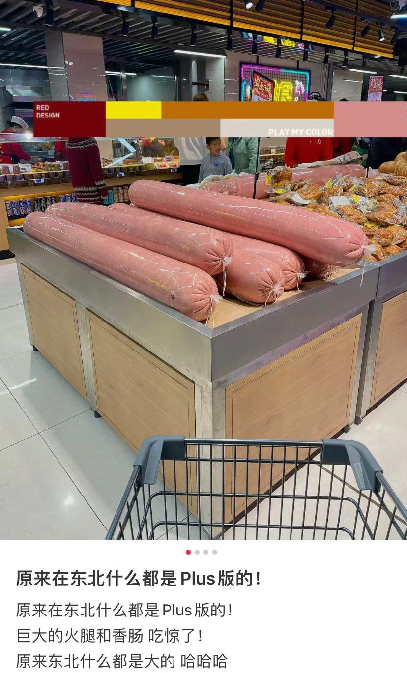 从装菜的盘子,超市的蔬菜,超市的香肠.......东北食物以一种“巨大化”的姿态冲击网友心灵。当然这也和当地气候文化密不可分,极寒的温度下,人需要用高热量、高蛋白的食物补充身体能量,久而久之也就导致量大、肉多等客观情况。