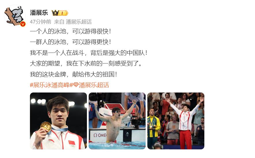 赛后,潘展乐在社交平台表示:“我不是一个人在战斗,背后是强大的中国队!我的这块金牌,献给伟大的祖国!”
