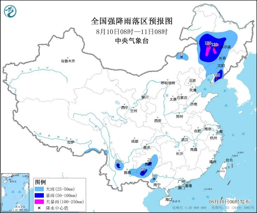 预计,8月10日08时至11日08时,内蒙古中东部、黑龙江中部和西南部、吉林中西部、辽宁大部以及贵州中南部、广西西部、云南东南部和北部等地部分地区有大到暴雨,其中,内蒙古东南部、黑龙江西南部、吉林西部、辽宁东南部等地局地有大暴雨(100~180毫米)。上述部分地区伴有短时强降水(最大小时降雨量20~50毫米,局地可超过80毫米),局地有雷暴大风等强对流天气。