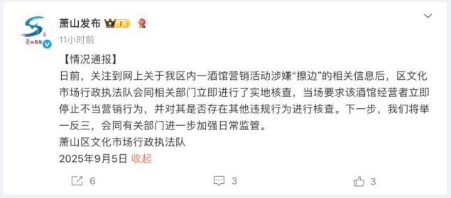 9月5日晚间,萧山区文化市场行政执法队发布情况通报: