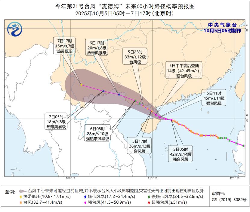 大风预报:5日8时至6日8时,南海西北部和中西部海域、东沙群岛、西沙群岛、北部湾、琼州海峡、广西南部及沿海、广东南部及沿海、海南岛及沿海将有6至8级、阵风9至10级的大风,其中,南海西北部海域、琼州海峡、北部湾北部海域、广东雷州半岛及沿海、广西沿海、海南岛东部和北部沿海的风力有9至11级、阵风12至13级,部分海域或地区风力可达12至14级,阵风15至16级。