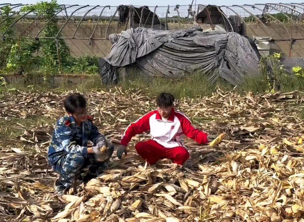 国庆中秋假期,孟成(左)穿着新生军训时发的迷彩服和陈浩宇在地里掰玉米。