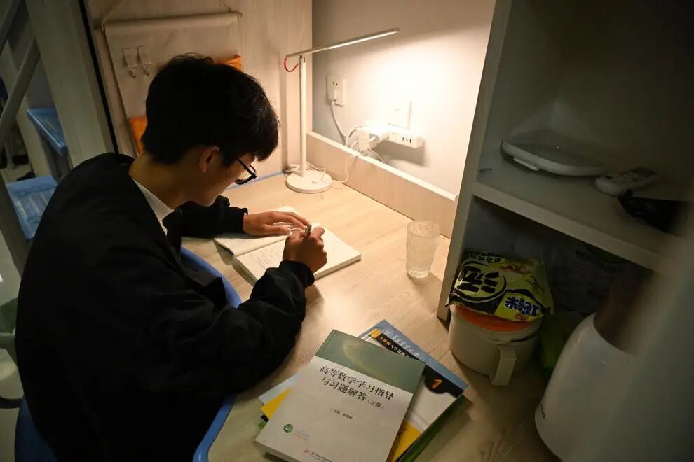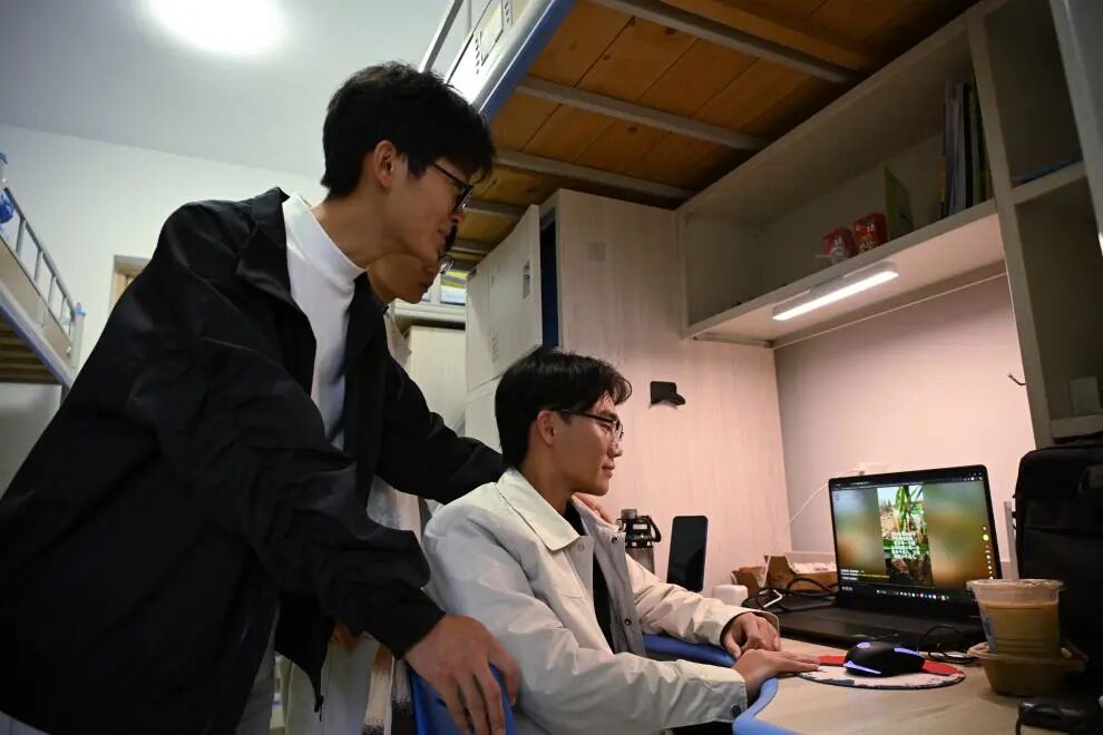 10月11日,孟成(左)在学校寝室向室友介绍自己之前发布的在地里干活的视频。