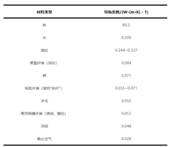 我们目前常用在保暖衣服中的羽绒、羊毛、棉等天然纤维,以及腈纶、粘纤、涤纶等,都是热导率相对比较低的材料。但如果要说目前世界上热导率最低的物质,还得是静止的空气。