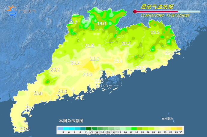 珠三角南部和粤西大部市县阴天有小雨,其余市县多云,局部有小雨。最低气温:粤北市县19~22℃,珠三角大部和粤西市县23~25℃,其余市县21~23℃。