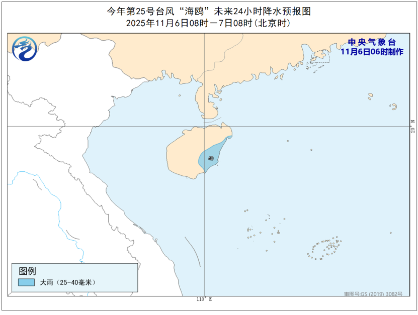 降水预报:今日至7日08时,海南岛东南部的部分地区将有大雨(25-40毫米)。