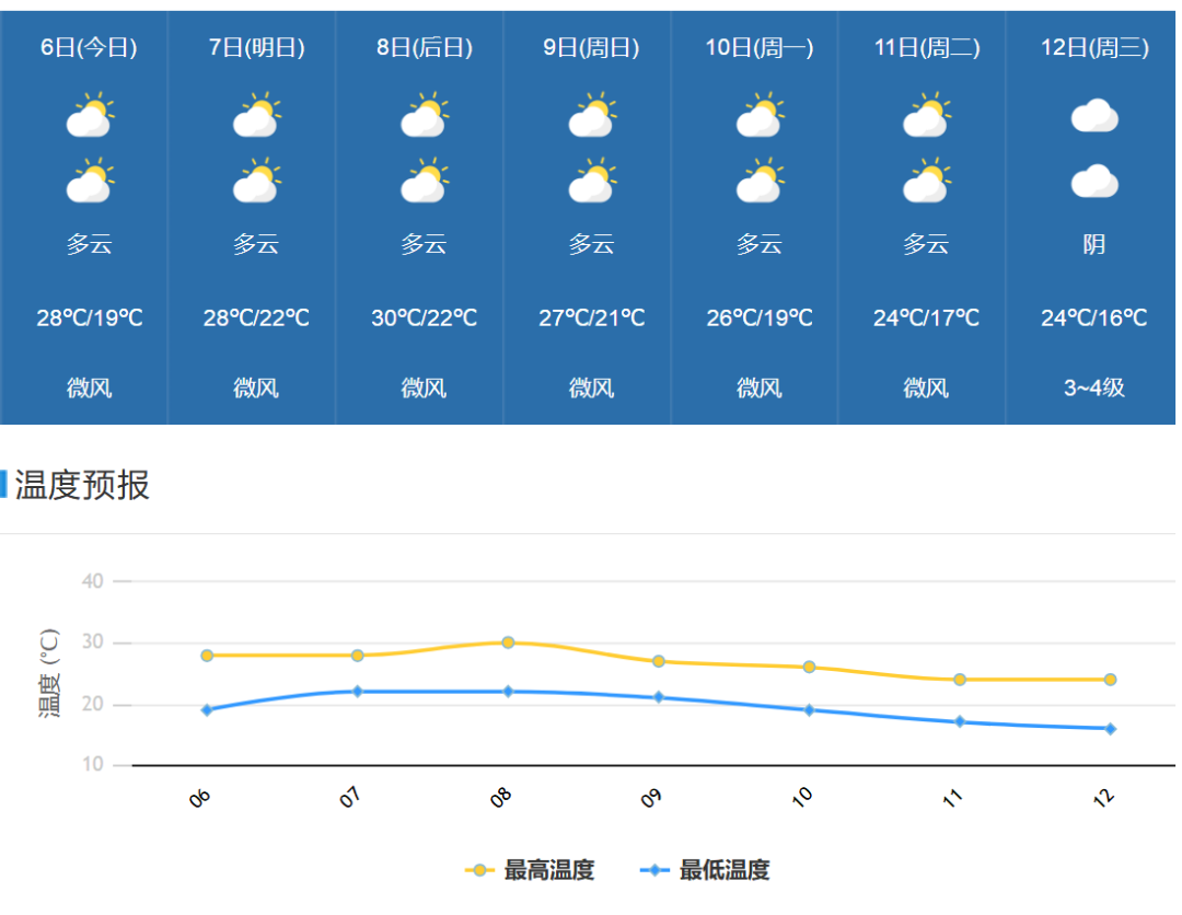 9日,多云间阴天,各地最低气温18到22℃,最高气温25到28℃;