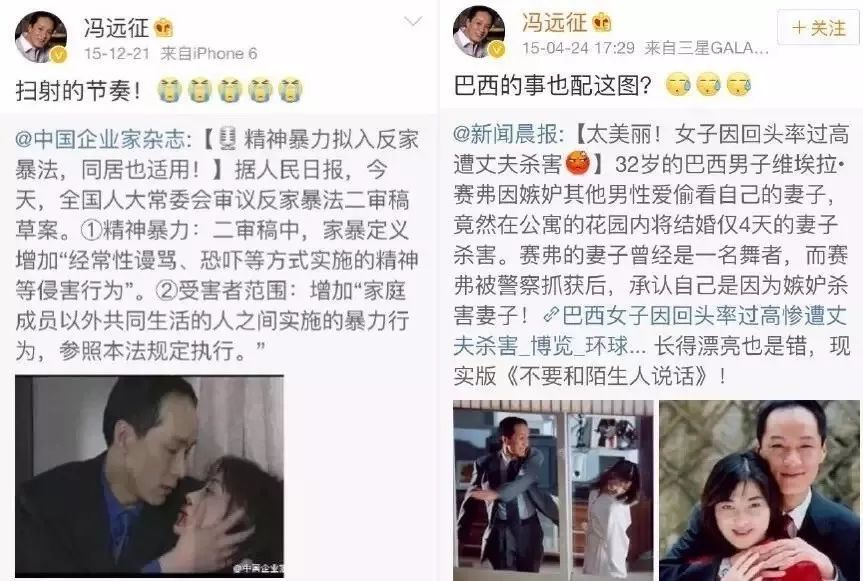 除了成为当年人人喊打的对象外,世界范围内,只要发生与“家暴”相关的新闻,配图必有冯远征。一年一度的反家庭暴力日,冯远征的微博也会爆炸。