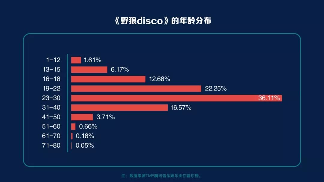 根据TME的相关数据,《野狼disco》的听众年龄圈层中,19~30岁的听众是主力,但和其他热门歌曲相比,《野狼disco》在40岁、甚至60岁以上的群体中都具有更高的传唱度,这也是歌曲作为“全民爆款”的有力证据。