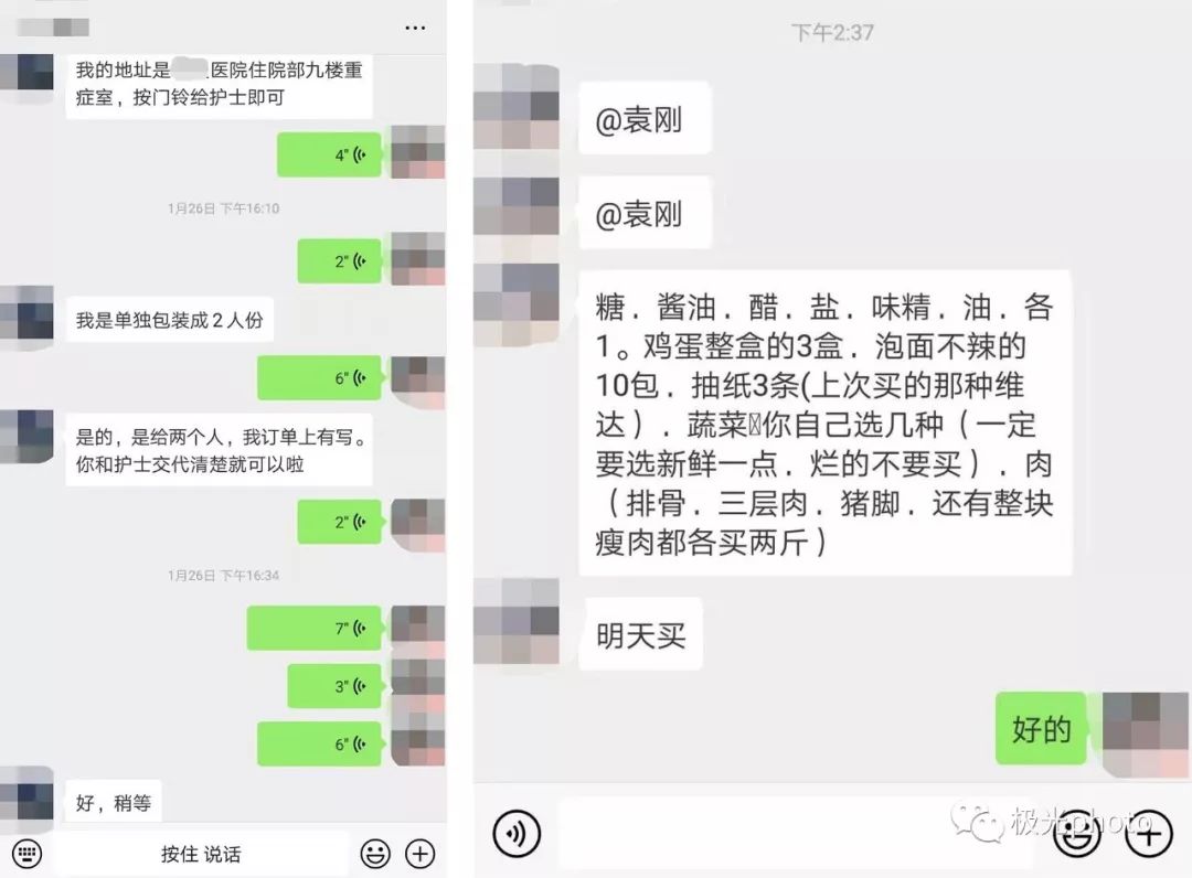 护士们会提前一天发消息给我,列好食物清单。收到单子后,我会提前去买,然后放在重症室门外,按门铃让护士出来取。