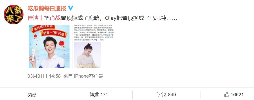 据网友晒出截图,佳洁士把肖战置顶换成了鹿晗,Olay置顶的肖战海报换成了马思纯……流量的反噬在商业逻辑中更为直接,对于肖战和团队而言,这口锅现在不管是不是你的,已经砸头上了。
