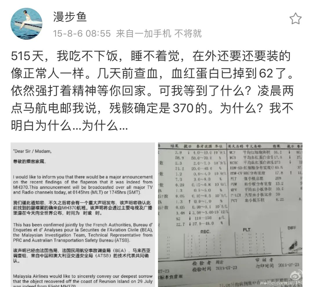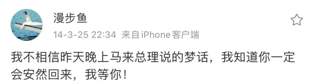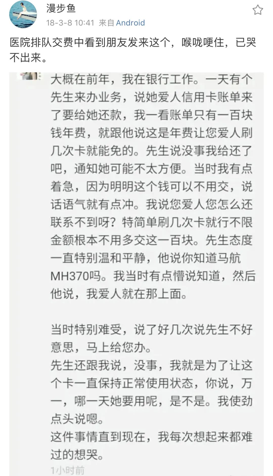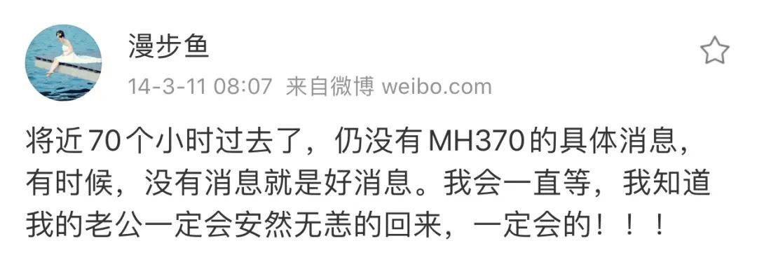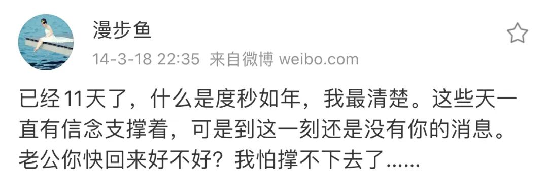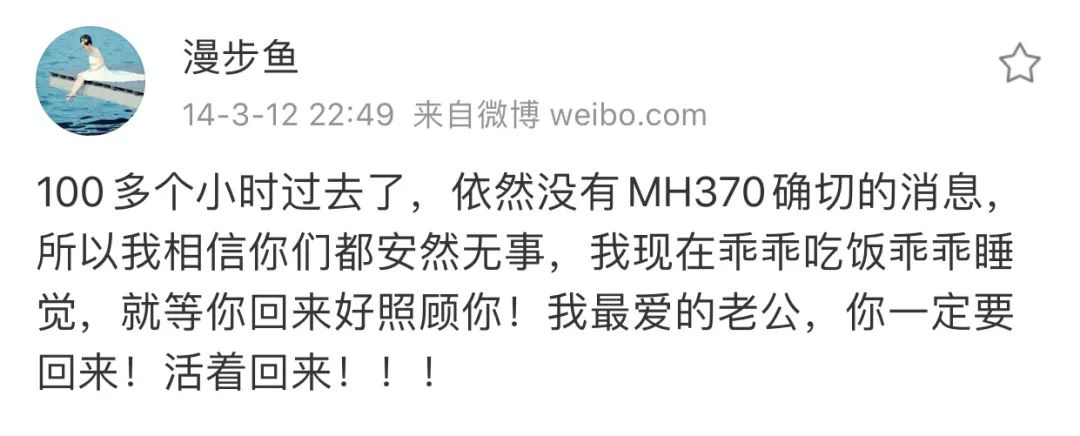 有一位叫做“漫步鱼”的网友,她的丈夫——一位安全程序工程师,出差归国坐上了这趟飞机,留下她,一直等到现在。