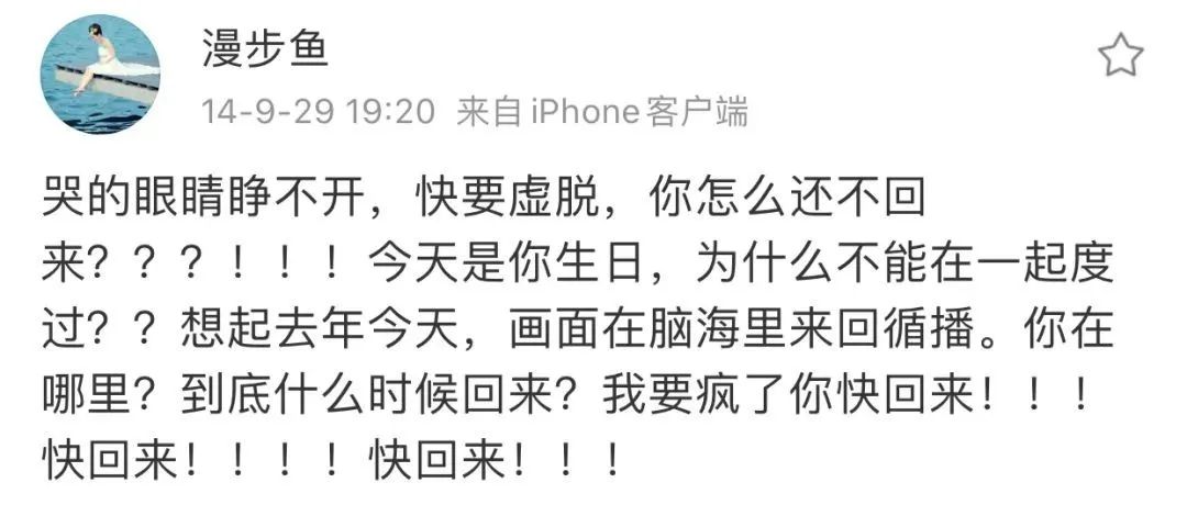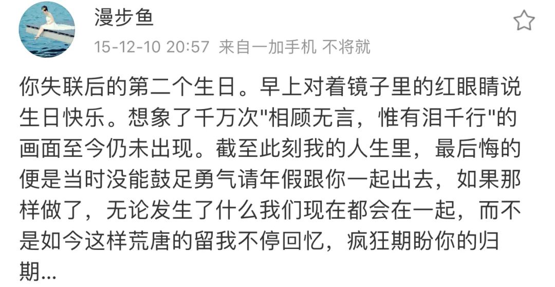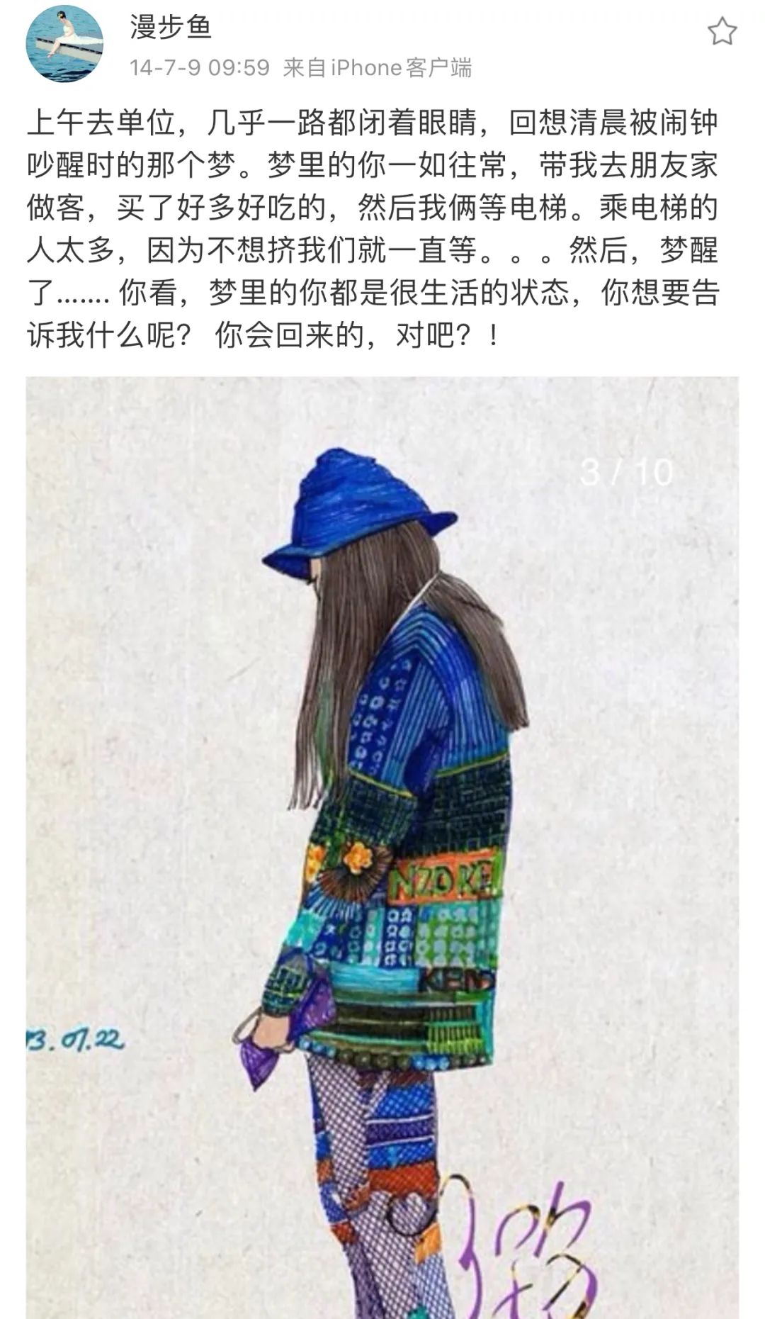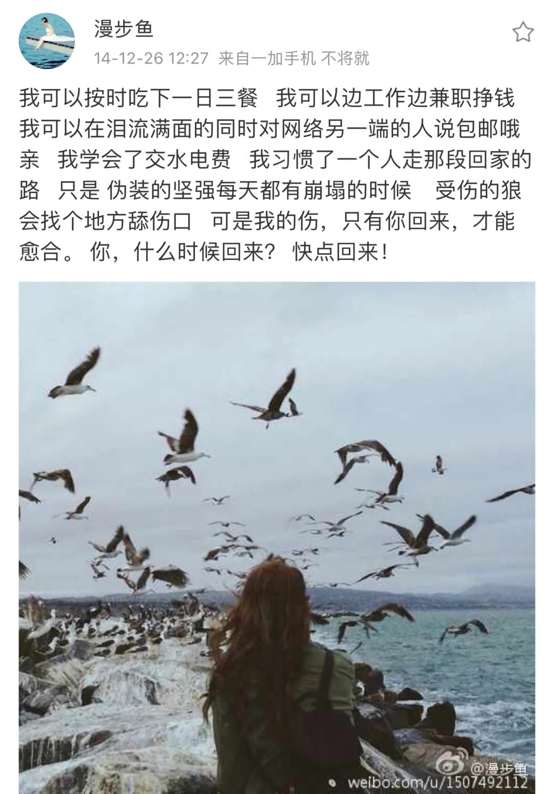 在漫步鱼的最后一条微博里,“你”变成了“那个人”,她不再谈梦,或许身体也已经好转,“回来”前面最终加上了“不会”。