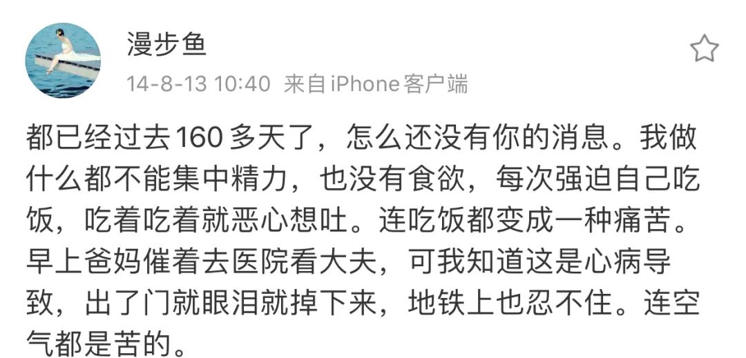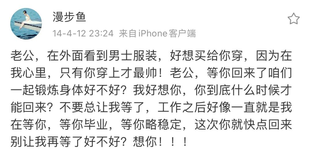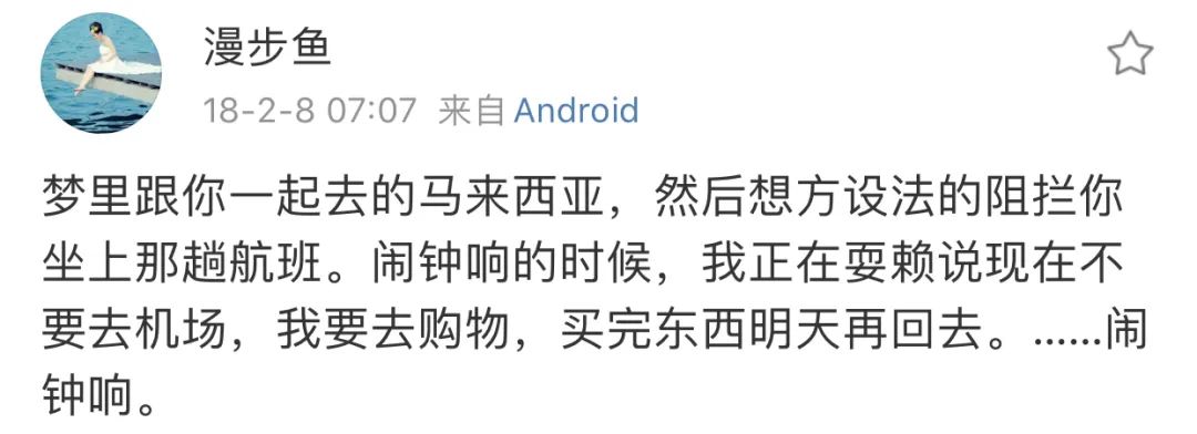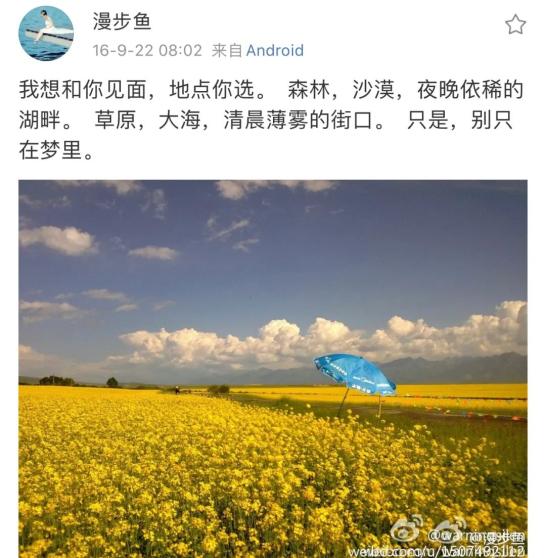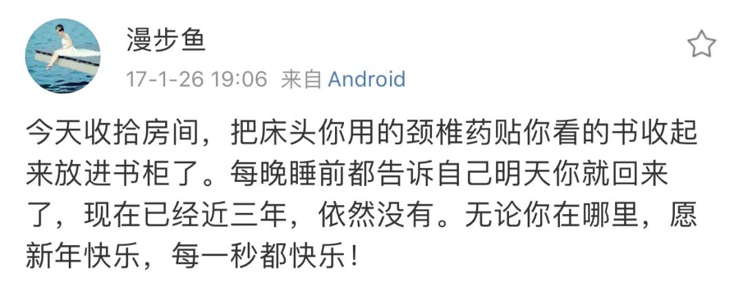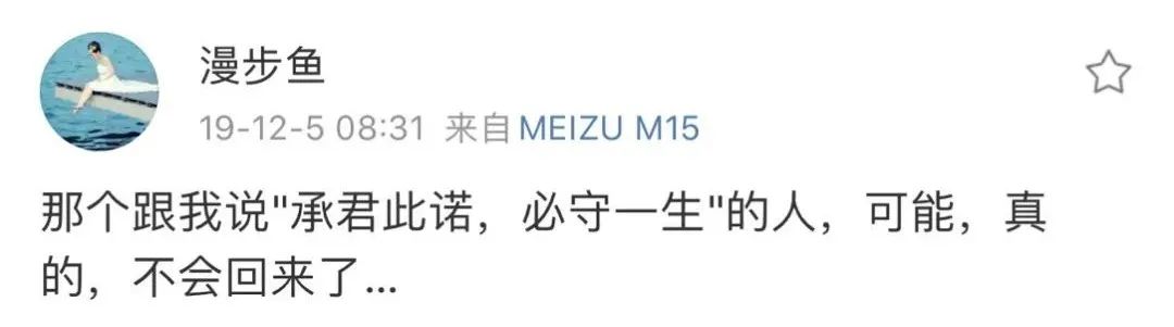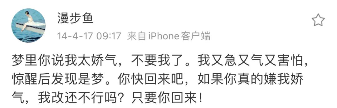 在漫步鱼的最后一条微博里,“你”变成了“那个人”,她不再谈梦,或许身体也已经好转,“回来”前面最终加上了“不会”。