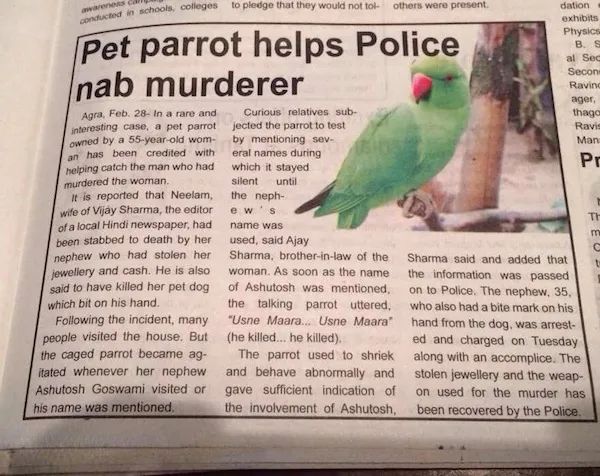 虽然故事听起来有一股印度特色的玄学感,但这只鹦鹉的确帮助警方确定了嫌疑人。经过调查取证,警方在死者侄子的手上发现了狗的咬痕,可能来自与死者同时遇害的宠物狗,随后还在其住所找到了凶器及被偷走的珠宝。