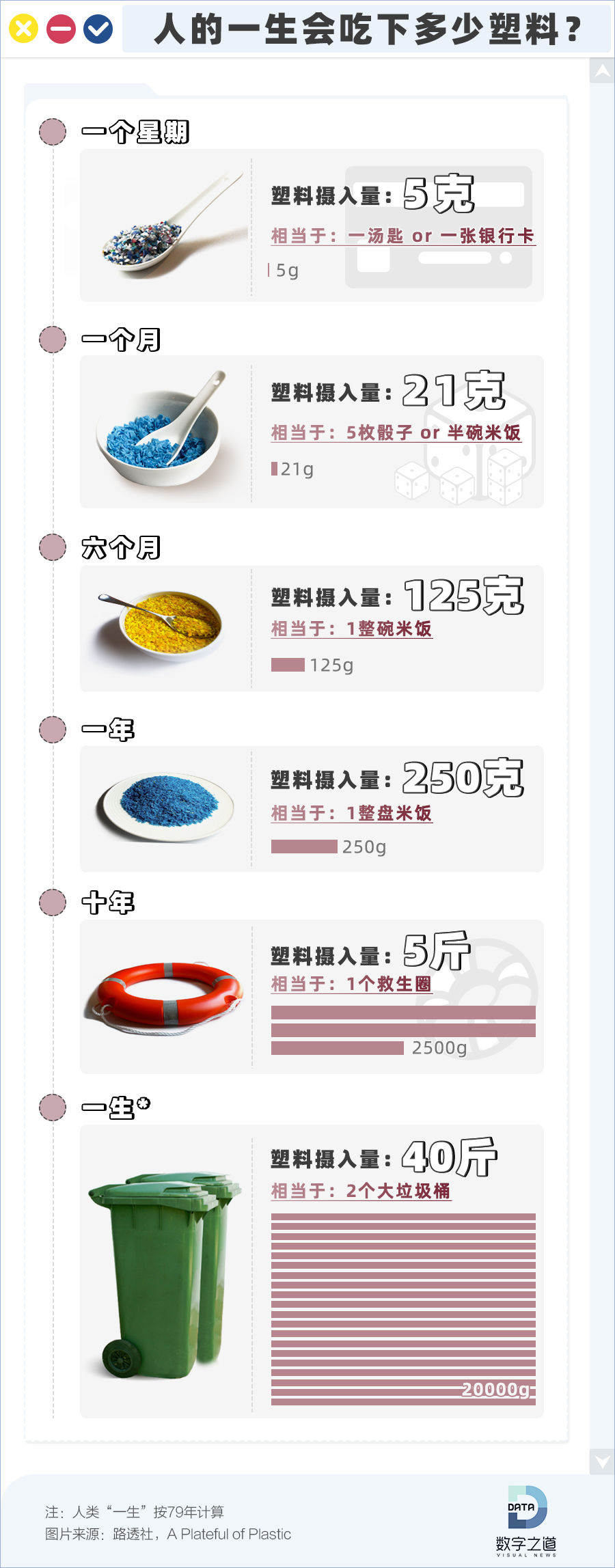 如果有人问“救生圈好吃吗?”你肯定满头问号:“我怎么知道?我又没啃过”。研究表明人类的“塑料摄入量”十分惊人,大概每周吃掉一张银行卡、每月吃掉5枚骰子、每年吃掉半斤塑料、每10年就能吃掉一个大救生圈……