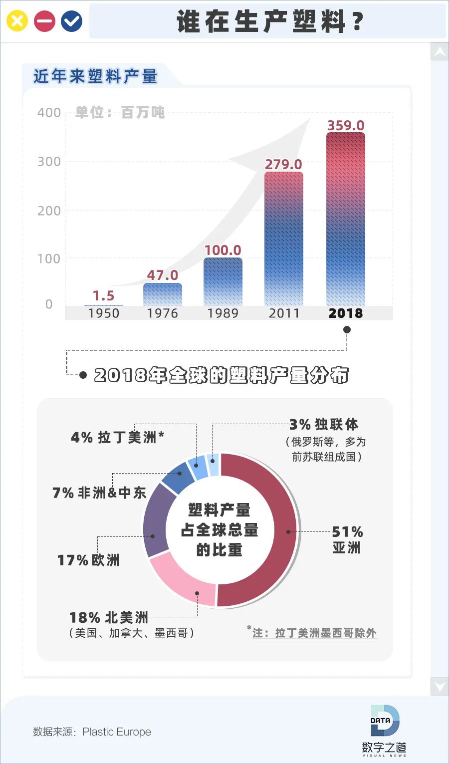20世纪50年代,人类开始大规模生产塑料,自此全球塑料产量几乎一直保持指数级增长。Plastic Europe数据显示:2018年全球塑料产量比1950年增加了238倍。