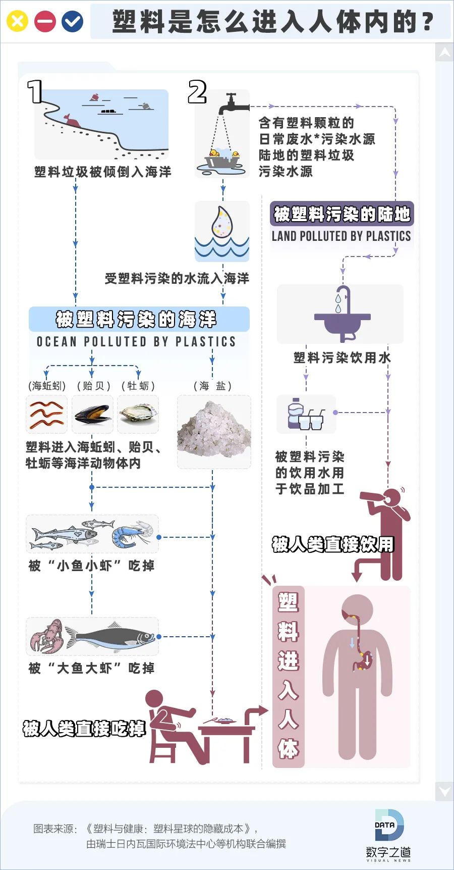 毫不夸张地说,塑料一旦进入环境,就会导致污染,通过土壤、陆生食物链、水生食物链和水源供应,不断在食物中累积,它们还可以轻易渗滤出有毒的添加剂,通过被其他生物吸收,最终可能直接或间接进入人体。