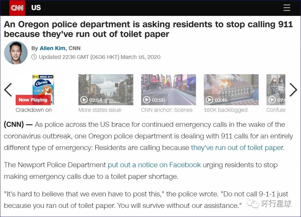 CNN报道,卷纸慌还惊动了美国警察,因为有太多人因为没有厕纸而拨打911求救。