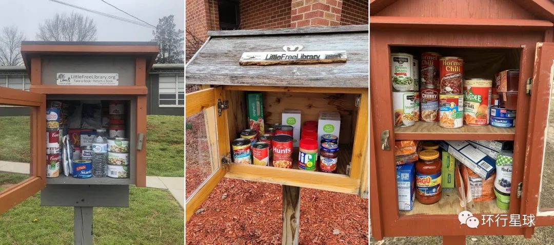 有人在流动图书架里放了免费食物,供需要的人拿取。