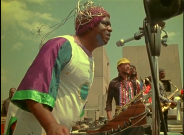 导演捕捉到Sun Ra和乐队的各种演出状态,小至排练时微妙的气氛,壮观至大乐队在类似庙会的场合演出,成员们排着队在人群中边走边演,杂耍/舞蹈的古怪青年混迹其中,呈现集体入迷的状态。更传统的演出中,萨克斯偏执狂妄的独奏让所有乐手静息,Sun Ra的键盘独奏则令人目瞪口呆。他手指僵直敲遍键盘,身体抽动,用手掌和手背轮番拍击键盘,甚至转身弹奏。无论身体如何看似毫不相干地动作,键盘发出的声音都是和谐。人和键盘已浑然一体。