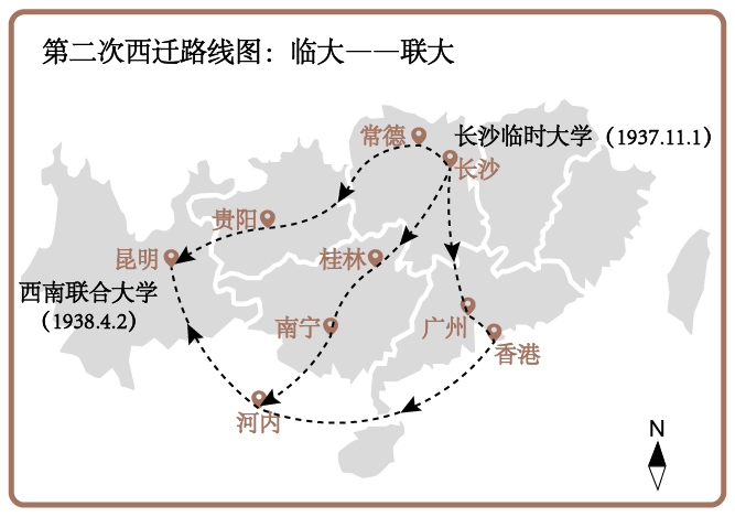 同年,持续三个月的淞沪会战于11月战败,12月,南京陷落,日军进逼武汉,长沙岌岌可危,长沙临时大学决定分三路西迁昆明。
