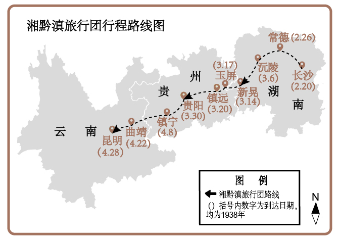 湘黔滇旅行团于1938年2月20日乘船从长沙出发,沿途经过的主要城镇有湖南的益阳、常德、桃源、沅陵、新晃,贵州的玉屏、镇远,贵阳、镇宁,云南的平彝、曲靖。