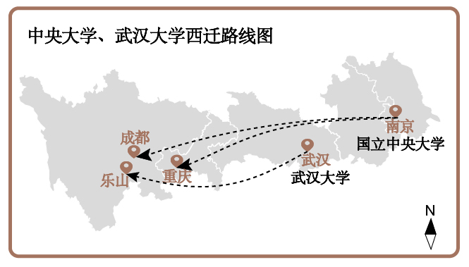 1937年10月,中央大学开始迁往重庆沙坪坝,医学院及农学院畜牧兽医系迁成都华西坝。屡经周折,1946年迁回南京,现为南京大学。1938年2月,国立武汉大学决定迁往四川乐山。1946年6月,武汉大学从乐山迁回武昌珞珈山,现为武汉大学。