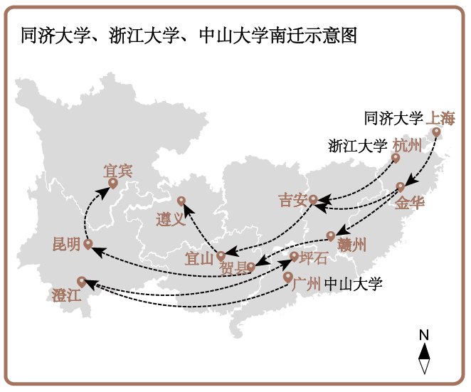 “七七事变”后,同济大学迁往浙江金华。同年11月,学校迁往江西赣州、吉安。1938年7月,同济大学迁往广西贺县八步镇。同年冬,再次迁往云南昆明。1940年10月,同济大学迁往四川宜宾李庄。1946月,迁回上海。现为同济大学。