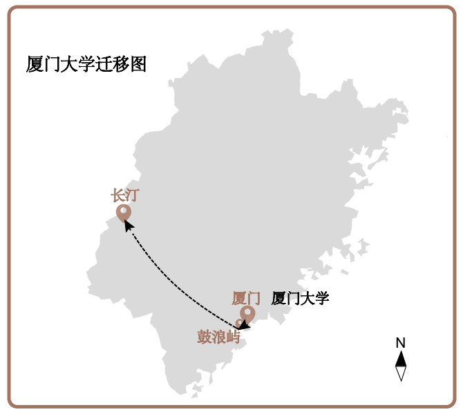 1937年9月,日军侵犯厦门,厦门大学被迫迁往鼓浪屿;11月间,学校决定迁往福建西部的长汀,并于次年1月抵达。1946年6月,厦门大学校本部开始迁回厦门,现为厦门大学。