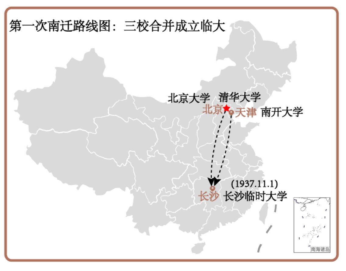 1937年“七七事变”,日本发动全面侵华战争。北平、天津相继沦陷,两地的大学面临灭顶之灾。8月28日,在胡适、傅斯年等人的倡议下,国民政府教育部授函南开大学、清华大学和北京大学三校校长,筹备成立长沙临时大学。