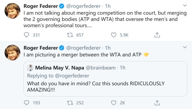 随后,瑞士人对网友的提问做出了进一步的解释。他表示自己的提议并非是指ATP(男子网球协会)与WTA(女子网球协会)在球场上的合作,而是更深层面的“两个网球管理机构的合并”。