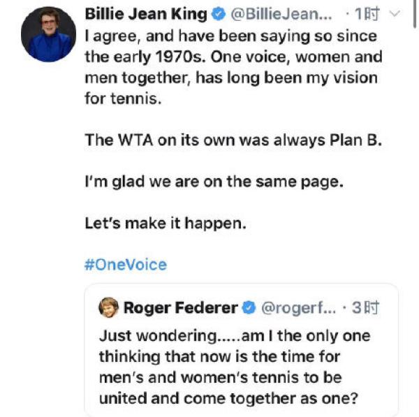 “也许ATP和WTA合并应该在更早些时候,但是现在的确到了需要变革的时候了。”费德勒写道,“目前所有运动都在最困难的时期,我们应该合二为一、更加团结地走下去。”