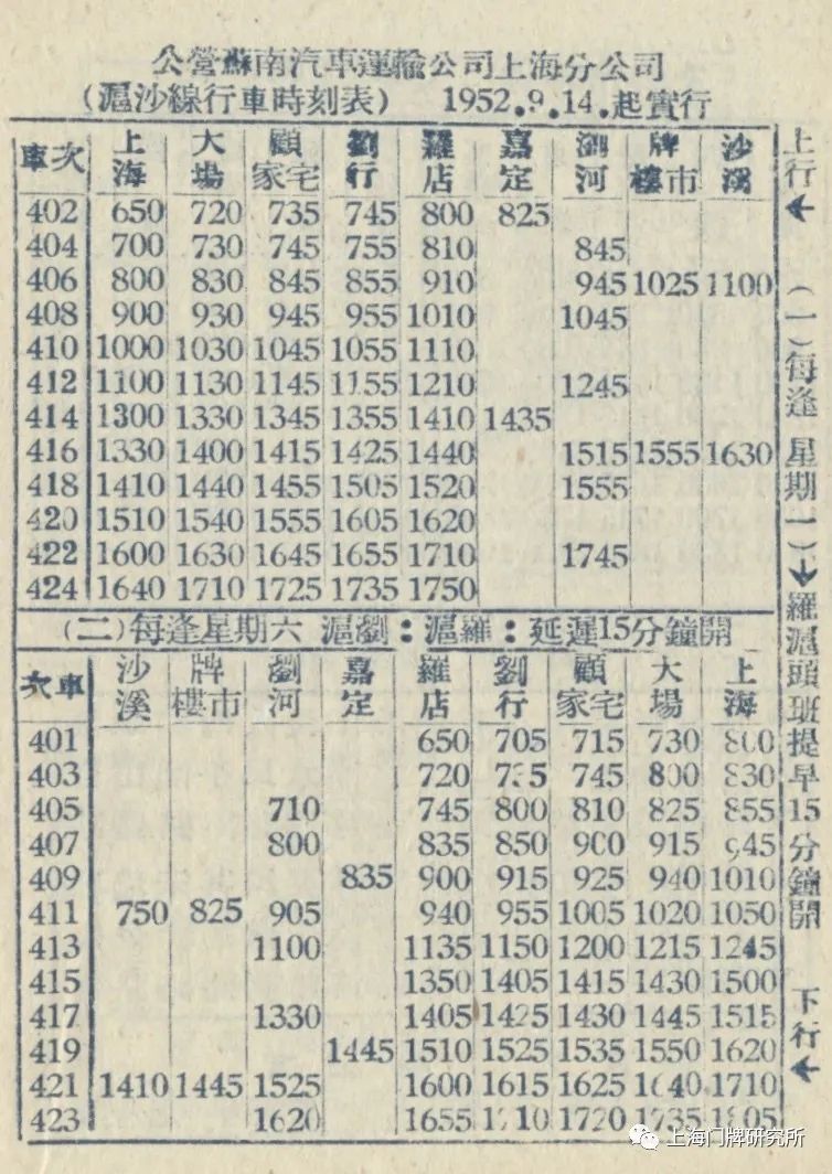 1952年7月1日,公营苏南汽车运输公司上海分公司正式接办沪太公司各线客运业务,沪太干线(上海—浏河)客运改为沪沙线(上海—沙溪)的一个区间段,由“苏南”提供26座的大客车12辆来承担。7月16日,苏南公司又将上海车站迁并虬江路865号锡沪长途汽车上海车站,浏河汽车站则移至浏河新闸桥南堍100米外。沪沙线每天早上6时50分至下午16时40分开行,最大间隔为每隔一小时1班,全天共12个班次。且仍秉承过去“沪太”的优良传统,每星期一早上头班车提早15分钟发出,每星期六末班延迟15分钟发车。