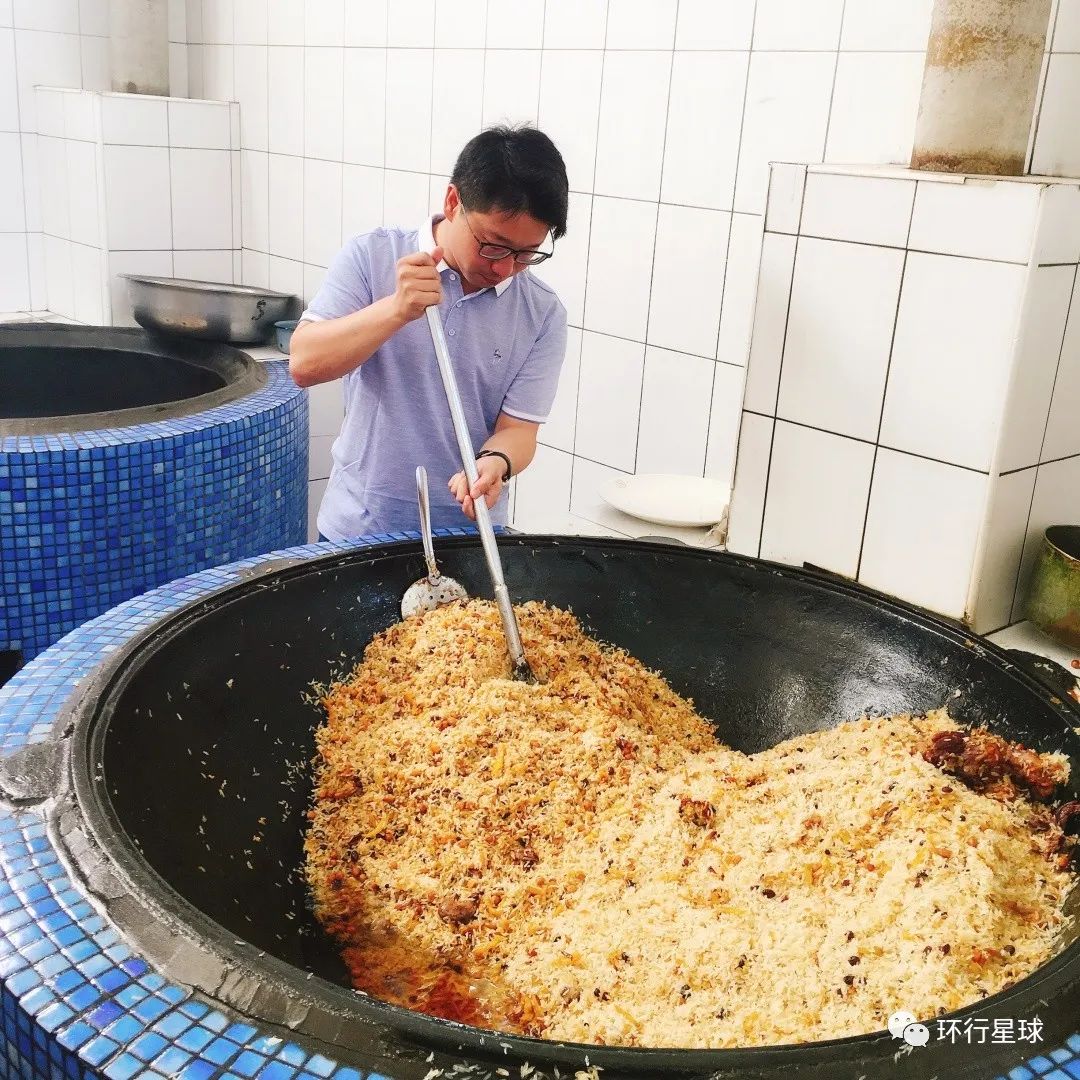 所有年轻的宾客们纷纷起身站成一列,队伍从厨房一直排到宴会厅的餐桌旁,厨师将刚出锅的热腾腾的抓饭盛出后递给离自己最近的宾客手中,然后后者将手中的抓饭传递到身后的人手上,身后的人再继续依次传递,餐盘经过了队伍中所有人的双手,由最后一个人毕恭毕敬地端上餐桌。
